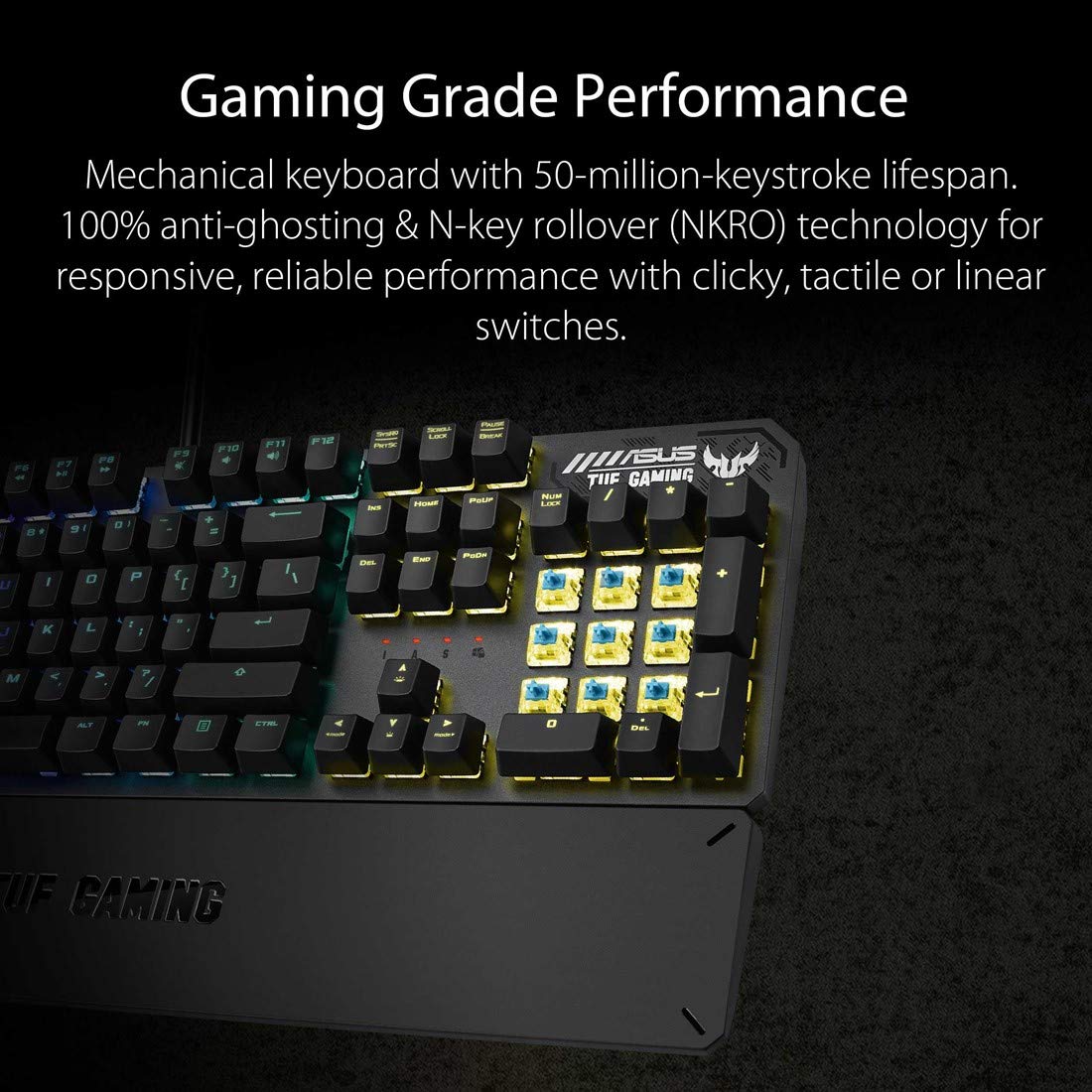 ASUS TUF K3 features heavy-duty & highly-durable mechanical switches with a lifespan of 50-million keystrokes for responsive & reliable performance during intense gaming sessions.