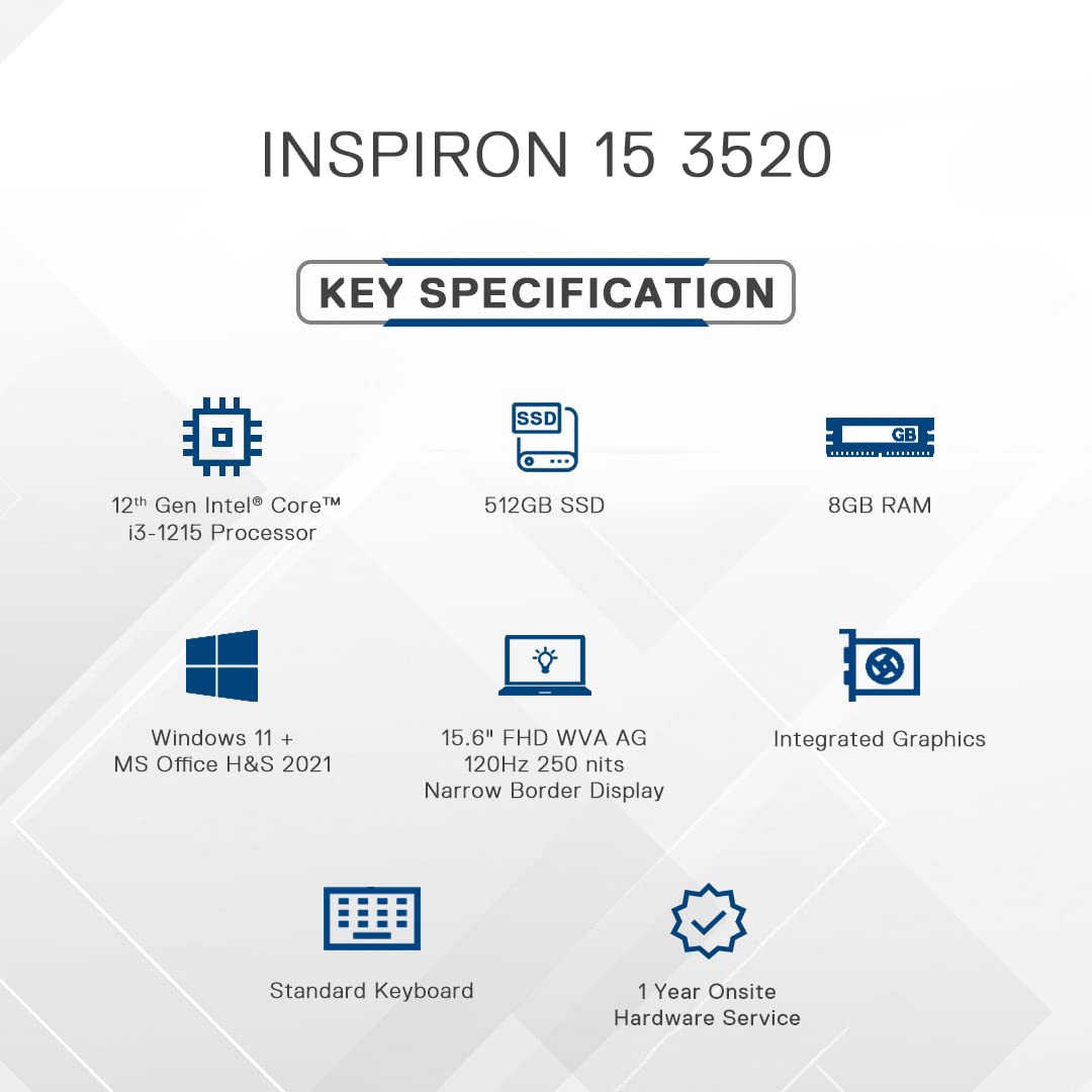 Dell Inspiron 3520 Laptop,12th Gen Intel Core i3-1215 Processor, 8GB, 512GB SSD, 15.6″ (39.62Cms FHD, Win 11 + MSO’21, Silver