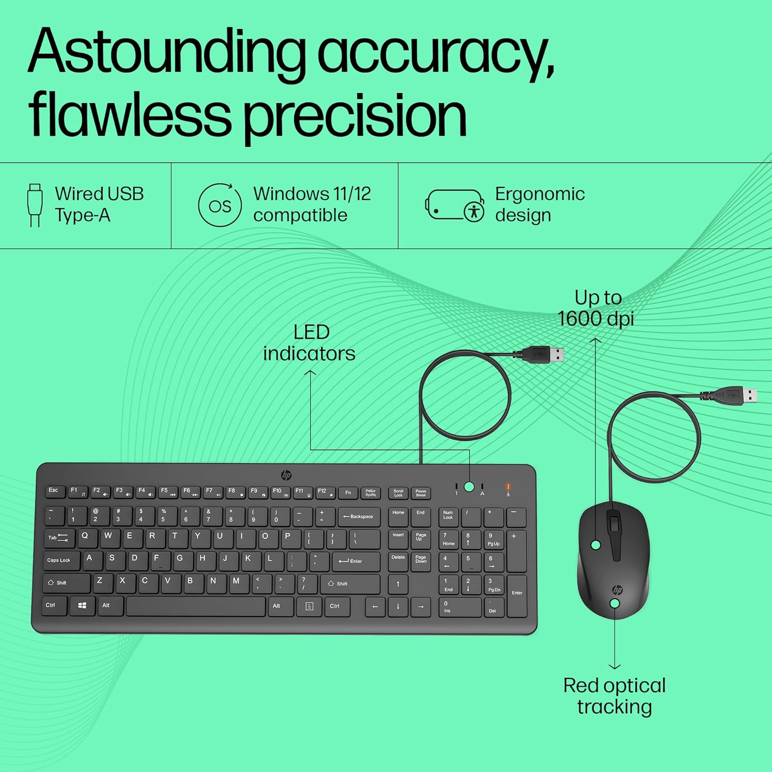 The HP 150 Wired Keyboard and Mouse Combo with Instant USB Plug-and-Play Setup with 12 Shortcut Keys and 6° Adjustable Slope Keyboard