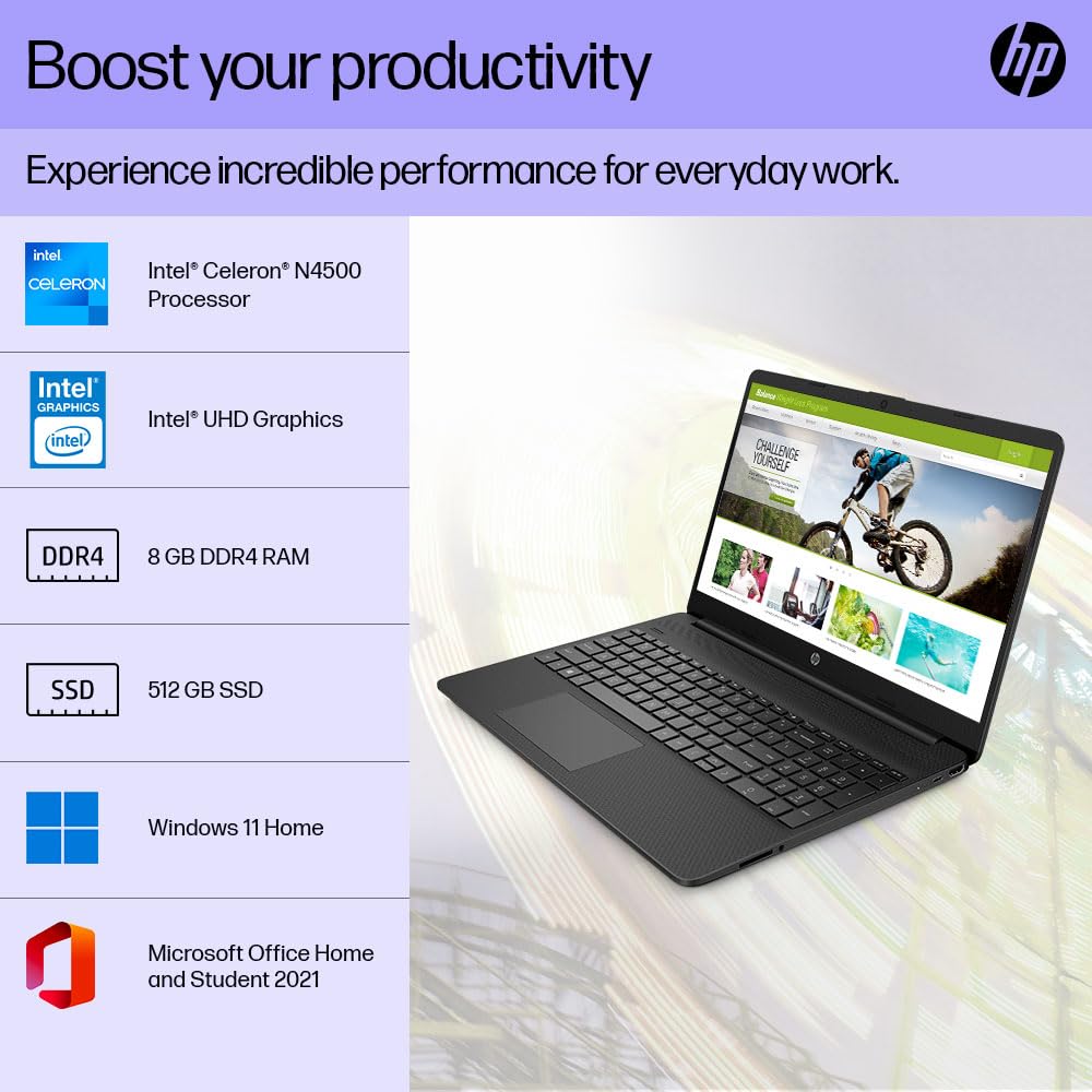 The HP Laptop 15 (7W475PA#ACJ) features an Intel Celeron N4500, 8GB RAM, 512GB SSD, and a 15.6″ HD micro-edge display, reliable computing yet stylish laptop that makes the wallet happy.