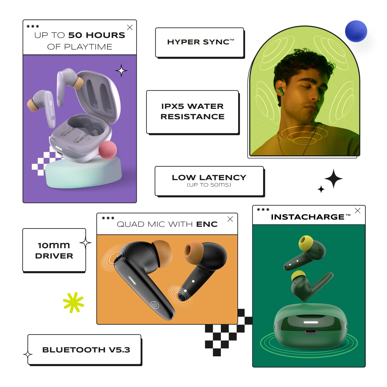 Noise Buds VS401 in-Ear Truly Wireless Earbuds with 50H of Playtime, Low Latency(up-to 50ms), Quad Mic with ENC, Instacharge(10 min=200 min), 10mm Driver, BT v5.3