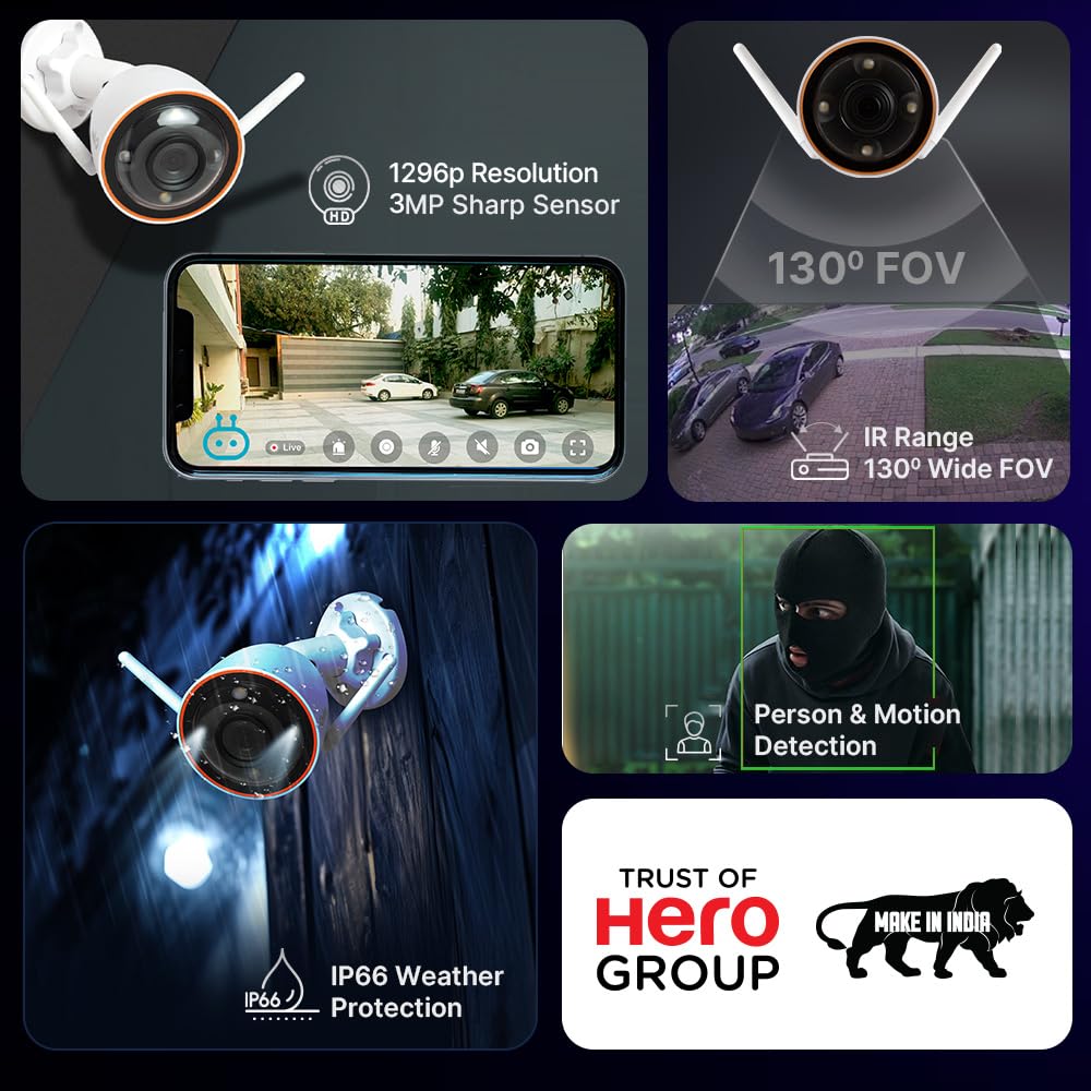 QUBO Smart Outdoor 3MP 1296p WiFi Bullet Camera from HERO GROUP | Color Night Vision | AI Person Detection | Smart Spotlight | IP66 Weather Resistant